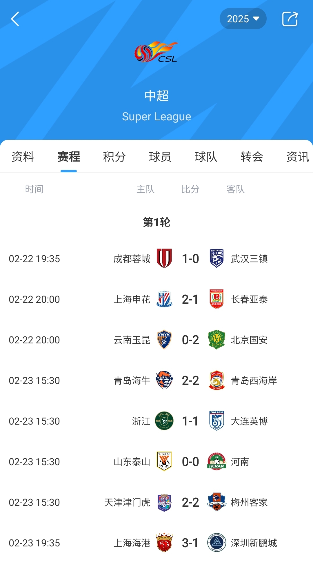 中超首輪賽果: