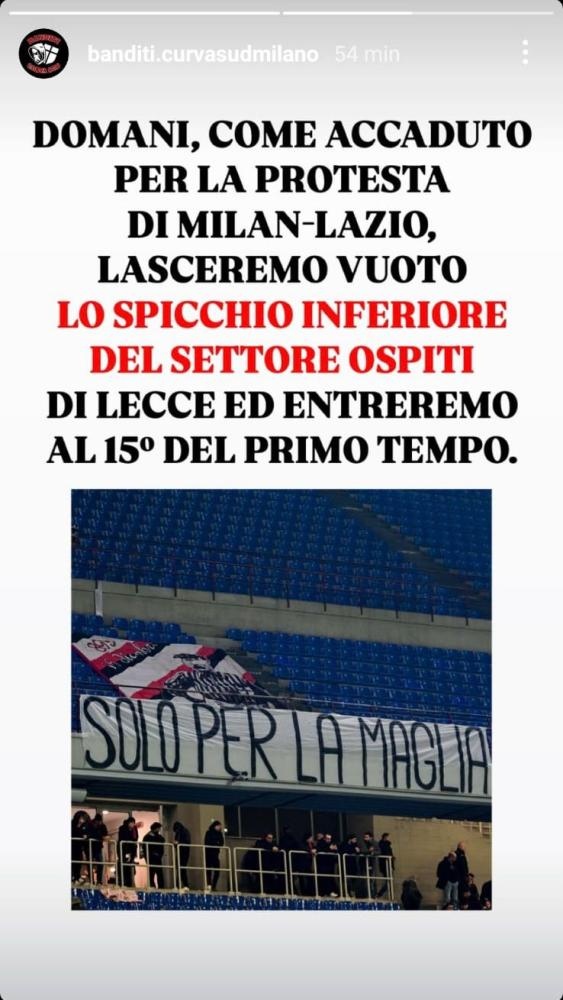 米蘭南看臺(tái)球迷組織在社交平臺(tái)上宣布:“明天,就像米蘭-拉齊奧時(shí)發(fā)生的抗議一樣,我們將會(huì)在萊切球場客隊(duì)坐區(qū)制造一片空?qǐng)觯覀儗?huì)從上半場第15分鐘再進(jìn)場。”