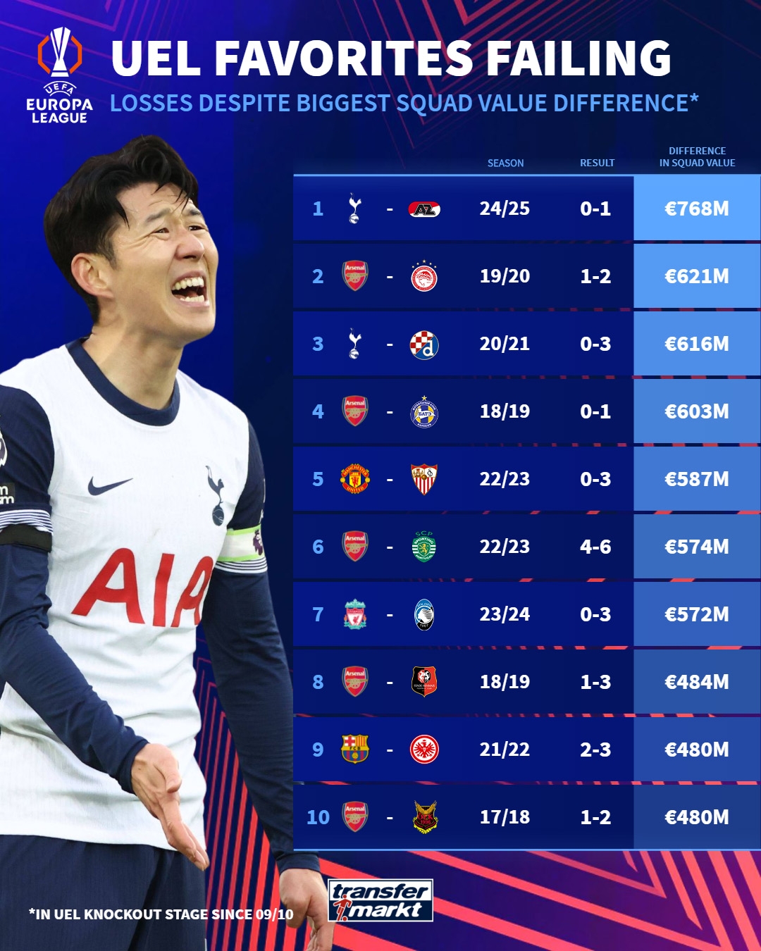 1、24/25賽季,熱刺0-1阿爾克馬爾,7.68億歐