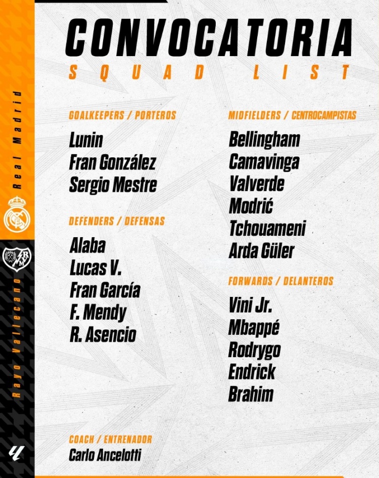 2025-03-09 23:05:01皇馬對(duì)陣巴列卡諾大名單:庫爾圖瓦缺席,姆巴佩&巴爾韋德在列