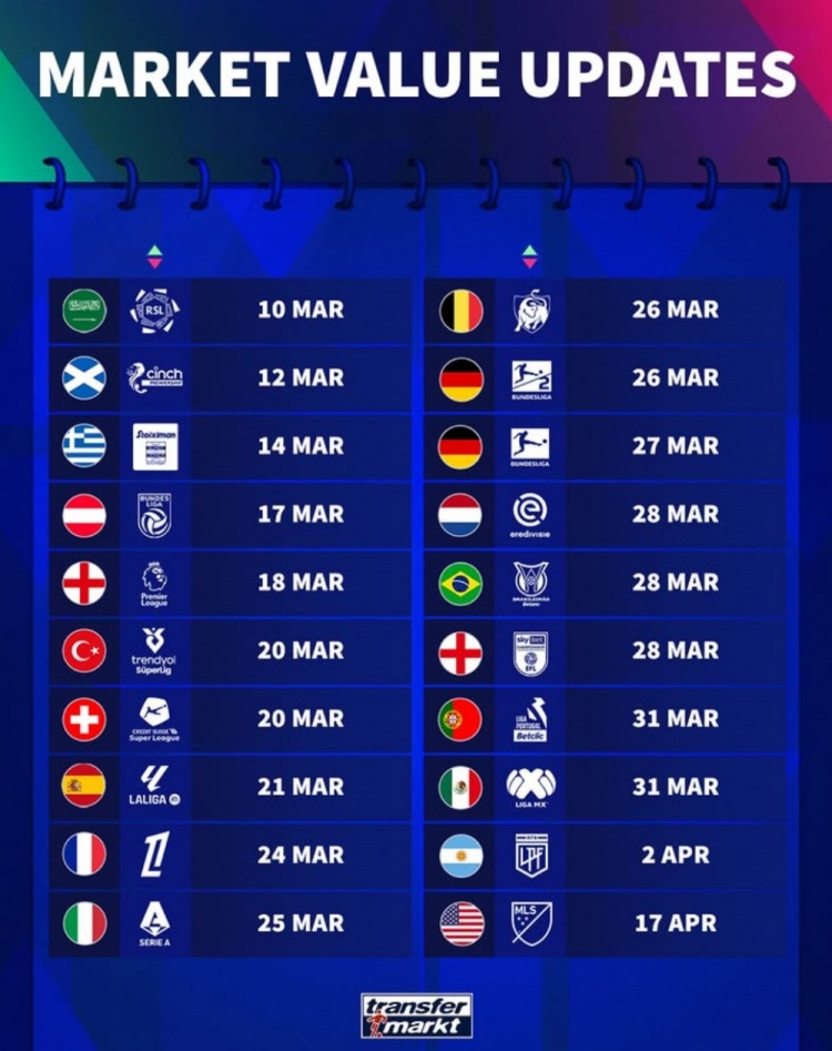 3月9日訊 德轉(zhuǎn)公布3-4月各聯(lián)賽球員身價更新時間,具體情況如下:
