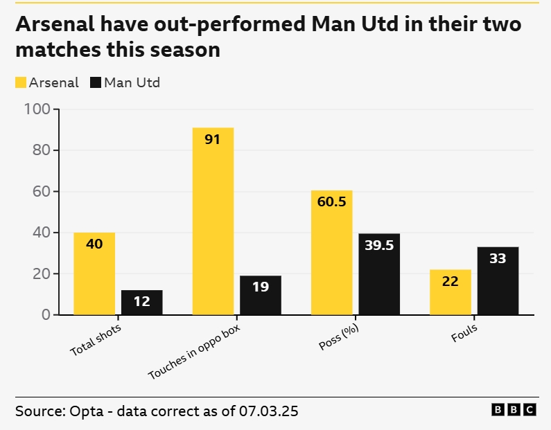 2025-03-09 23:11:25一邊倒?BBC:阿森納本賽季兩次交手曼聯(lián),多項(xiàng)關(guān)鍵數(shù)據(jù)占優(yōu)