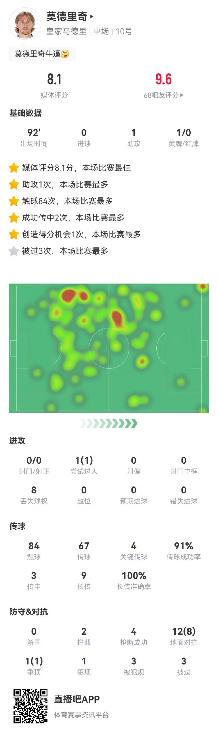 2025-03-10 06:01:24莫德里奇本場(chǎng)1助攻4關(guān)鍵傳球 10長(zhǎng)傳9成功 13對(duì)抗9成功 8.1分最高