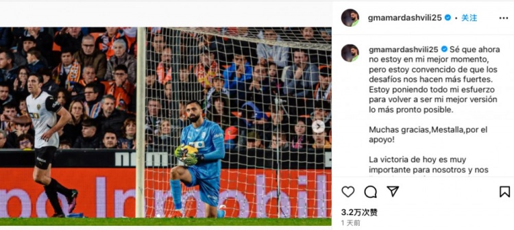2025-03-10 20:52:27出球被斷,瑪瑪達什維利社媒致歉:困難讓人變強,會拿出最佳水平