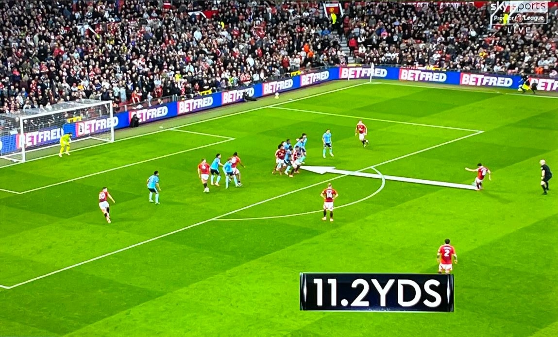 而賽中的轉(zhuǎn)播鏡頭也刻意給出了數(shù)字,鏡頭顯示,B費(fèi)的罰球點(diǎn)距離阿森納的人墻足足有11.2碼(約為10.24米),而規(guī)則要求的人墻與罰球點(diǎn)距離一般只有10碼(9.15米)。